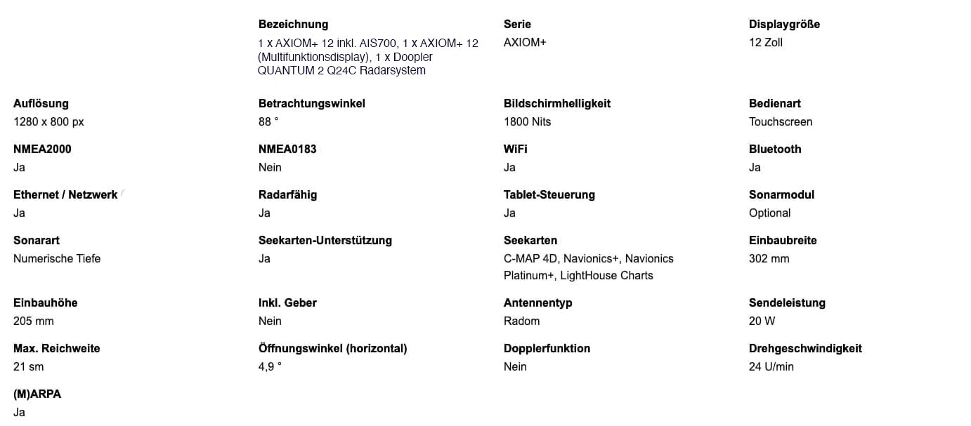1 x AXIOM+ 12 including AIS700, 1 x AXIOM+ 12 (multifunction display 12″), 1x Doopler QUANTUM 2 Q24C radar system and 15 m power and data cable.